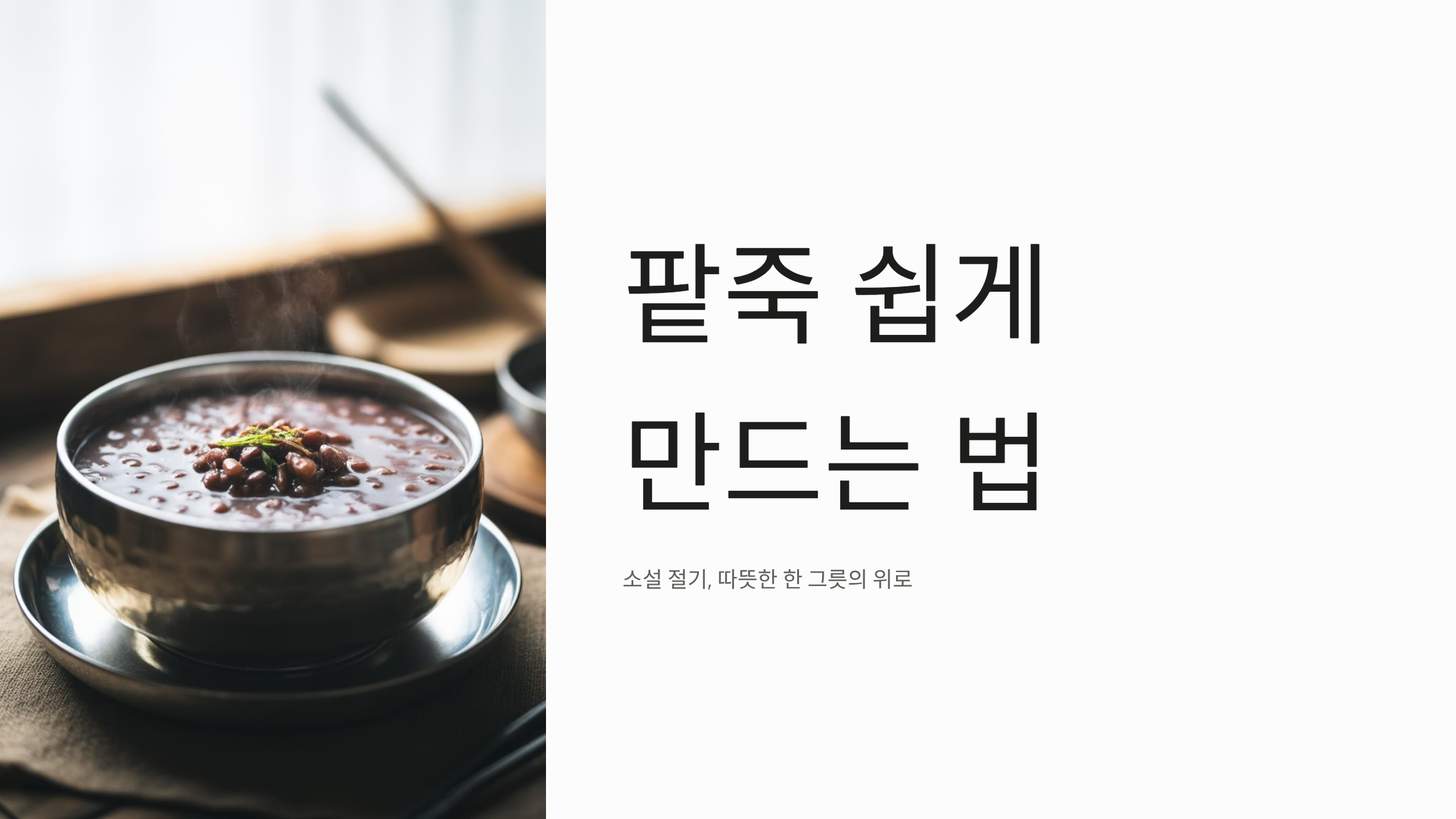 찬 바람이 불고 첫눈 소식이 들려오는 소설(小雪) 절기가 되면, 우리 몸은 본능적으로 따뜻한 기운을 찾게 됩니다. 예로부터 조상들은 이 시기에 붉은 팥죽을 쑤어 먹으며 다가올 겨울의 추위를 대비하고 집안의 액운을 막았습니다. 팥죽은 맛도 좋고 영양도 풍부하지만, 전통 방식대로 만들려면 팥을 삶아 체에 으깨고 껍질을 걸러내는 고된 노동이 필요해 선뜻 도전하기 어려운 요리이기도 합니다. 당신이 지금 팥죽 쉽게 만드는 법을 검색한 것은, 가족을 위해 따뜻한 팥죽을 끓여주고 싶지만 복잡한 과정은 줄이고 맛은 그대로 살릴 수 있는 효율적인 방법을 찾고 싶기 때문일 것입니다. 이 포스팅은 믹서기를 활용해 조리 시간을 절반으로 줄이면서도 진하고 부드러운 맛을 내는 초간단 팥죽 레시피를 공개하여, 이번 소설에는 집에서 직접 만든 팥죽으로 따뜻한 정을 나누실 수 있도록 돕겠습니다.