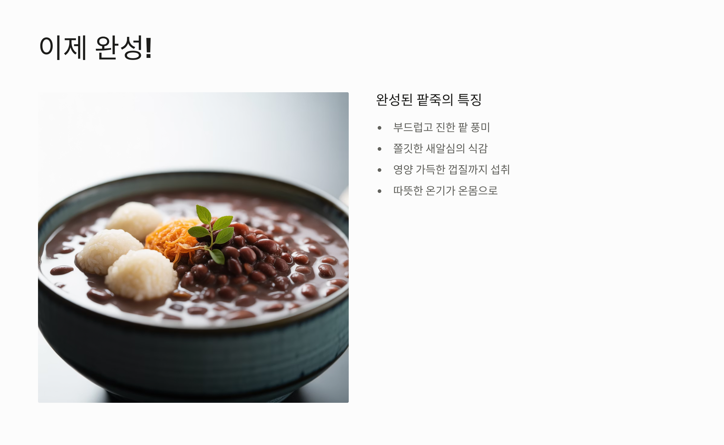 - 최종 간 맞추기: 소금으로 기본 간을 하여 팥의 단맛을 끌어올립니다. 기호에 따라 설탕을 추가하여 단팥죽으로 즐길 수도 있습니다. 단, 설탕은 먹기 직전에 넣어야 팥죽이 삭는 것을 방지할 수 있습니다.