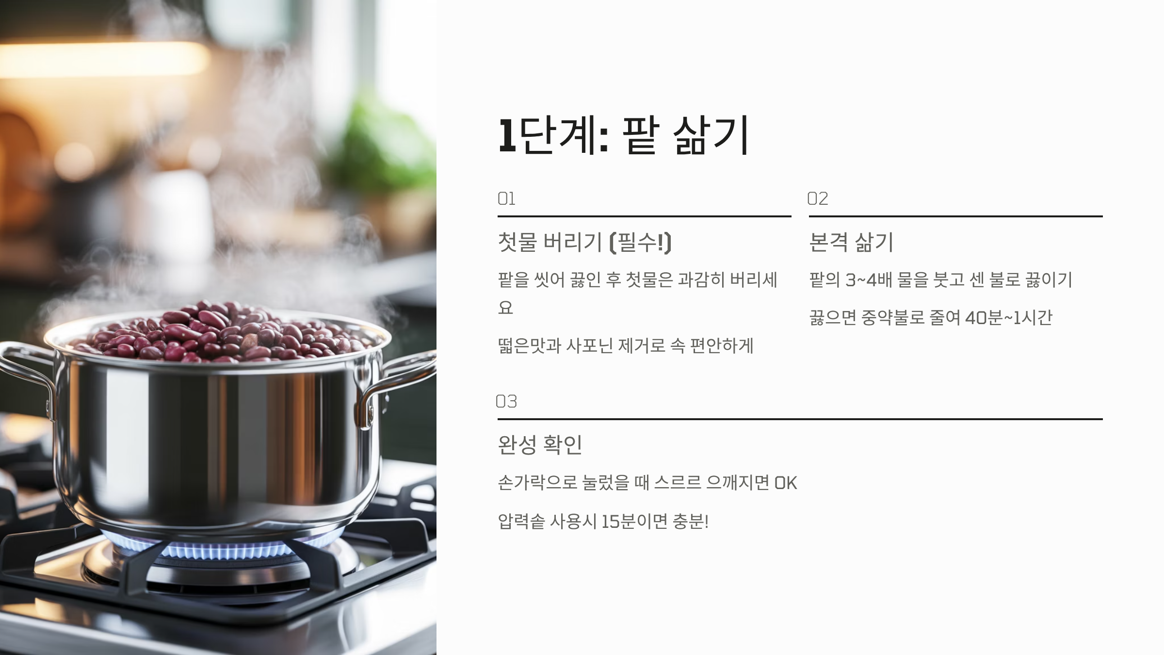 - 확인법: 팥알을 손가락으로 눌렀을 때 힘을 주지 않아도 스르르 으깨질 정도로 푹 익어야 나중에 갈았을 때 입자가 곱습니다.
