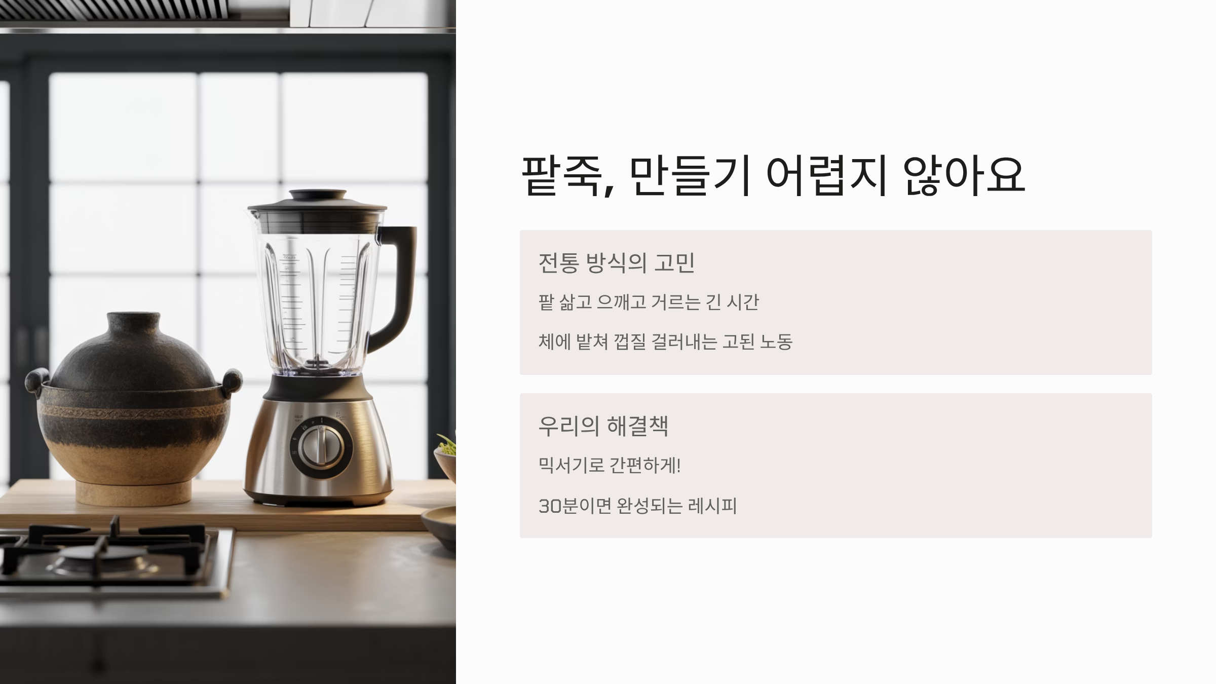 전통 팥죽 레시피에서 가장 힘들고 시간이 많이 걸리는 과정은 삶은 팥을 체에 밭쳐 껍질을 걸러내고 앙금을 내리는 일입니다. 하지만 현대적인 조리 도구를 활용하면 이 과정을 생략할 수 있습니다.