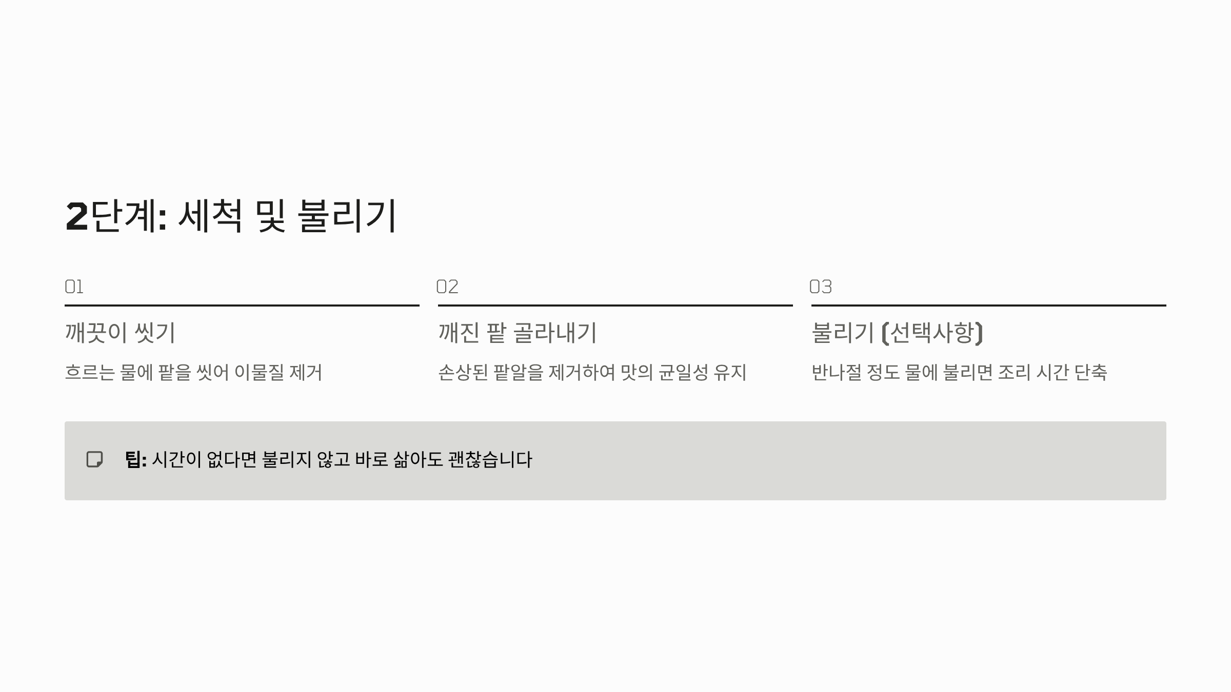- Tip: 이 과정은 팥의 껍질에 포함된 사포닌 성분을 제거하여 팥죽의 쓴맛과 떫은맛을 없애고, 배앓이를 방지하는 필수 과정입니다.