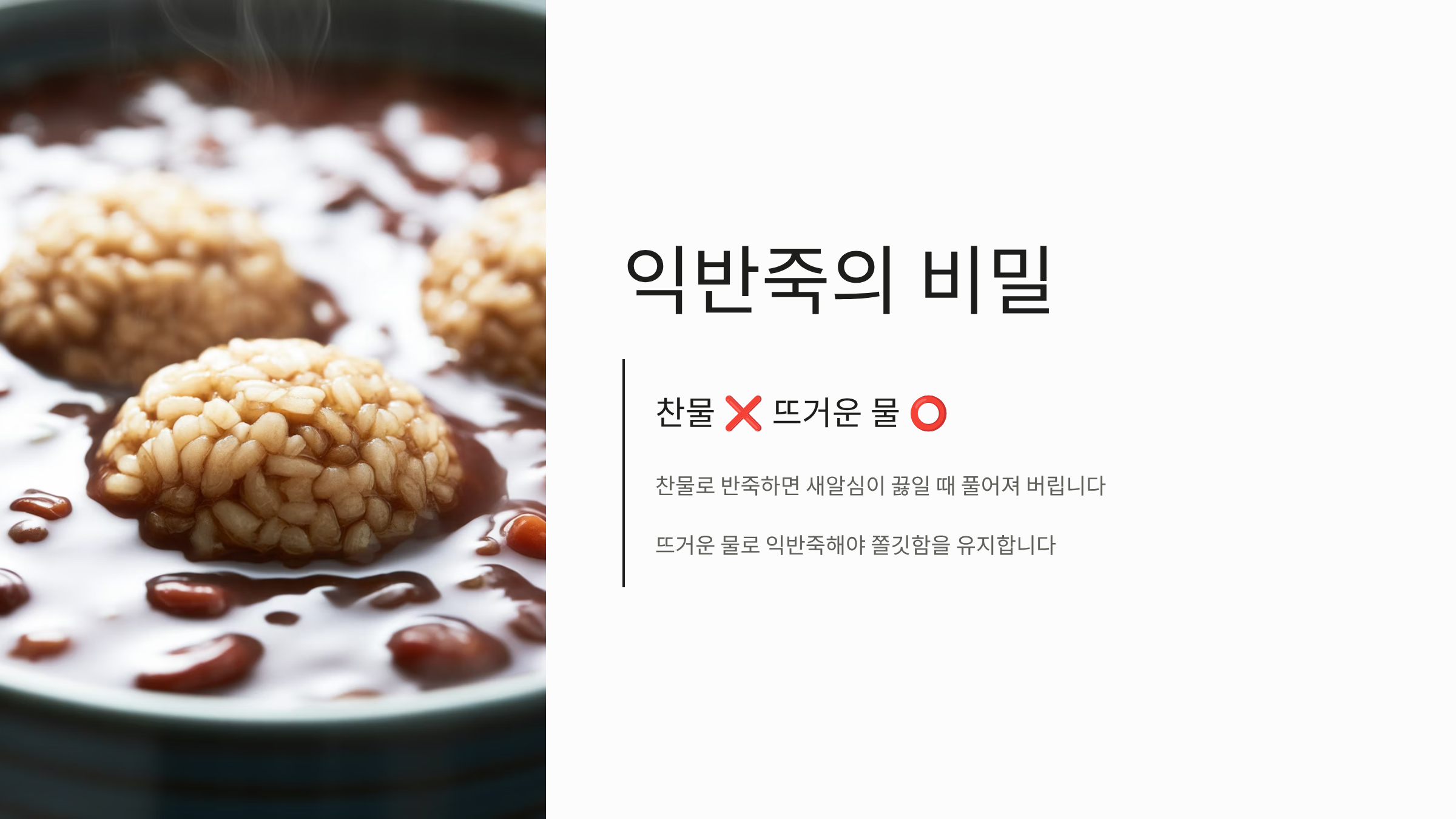 하지만 막상 집에서 팥죽을 끓이려고 하면 팥을 불리고, 삶고, 으깨는 과정이 너무 번거롭게 느껴져 망설이게 됩니다. 특히 불 조절을 잘못해 바닥을 태우거나, 새알심이 풀어져 죽이 되어버리는 실패 경험은 초보자들이 팥죽 만들기를 꺼리는 주된 이유입니다.