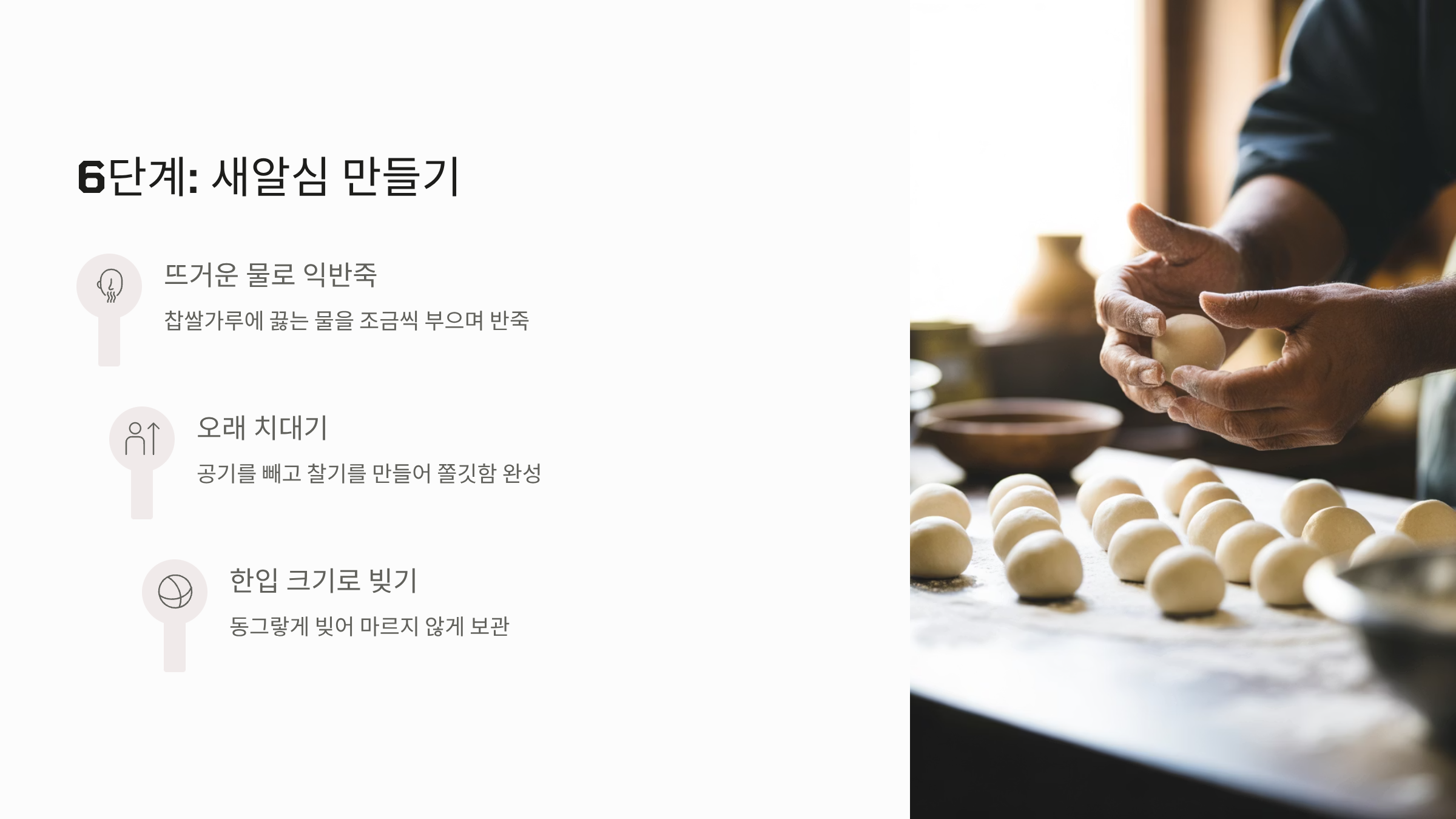 - 많이 치대기: 반죽을 오래 치댈수록 공기가 빠지고 찰기가 생겨 더욱 쫄깃해집니다. 매끄러운 반죽이 되면 한입 크기로 동그랗게 빚어줍니다.
