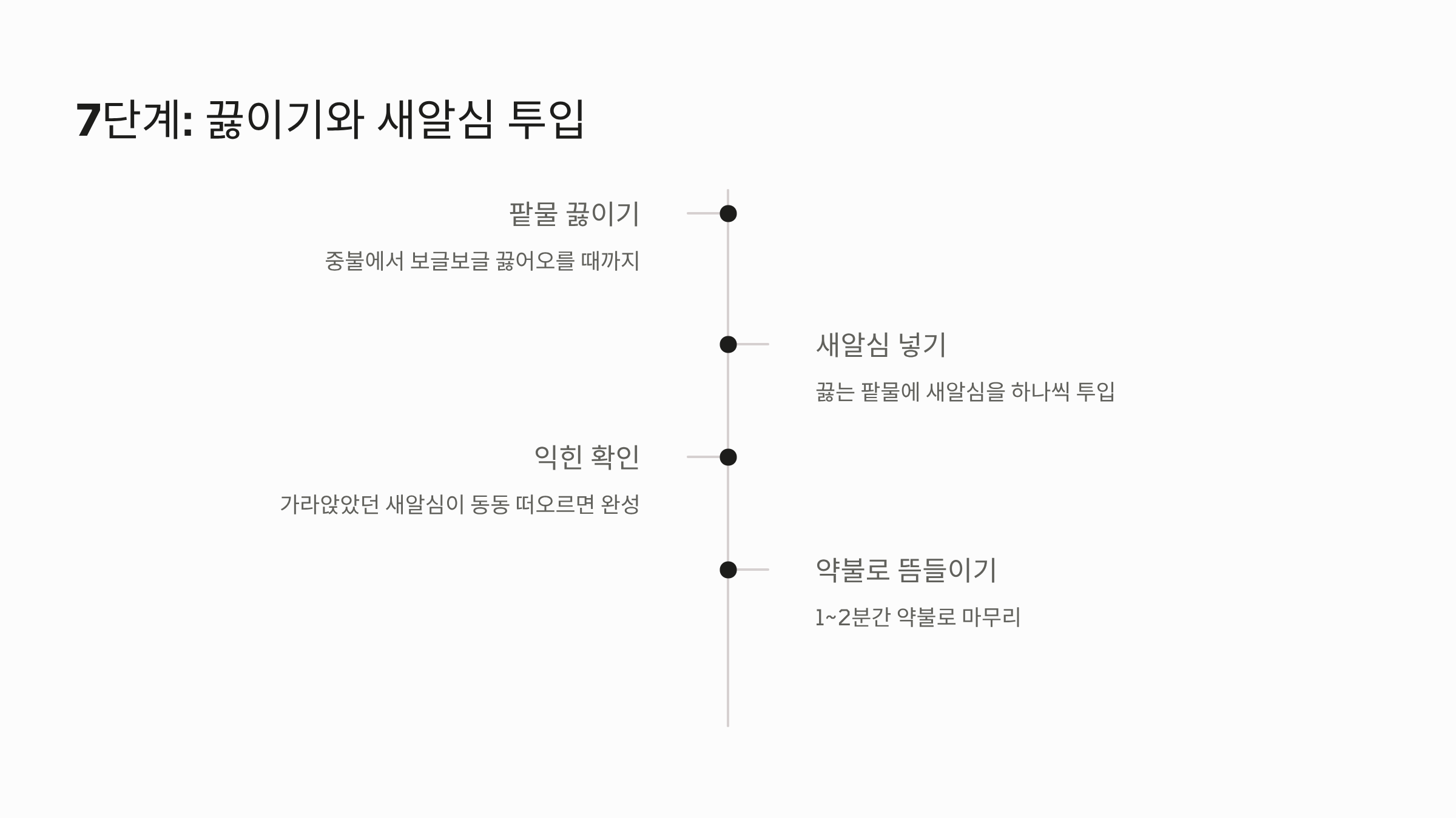- 익힘 확인: 가라앉아 있던 새알심이 익으면 동동 떠오릅니다. 이때부터 약불로 줄이고 1~2분간 더 뜸을 들입니다.
