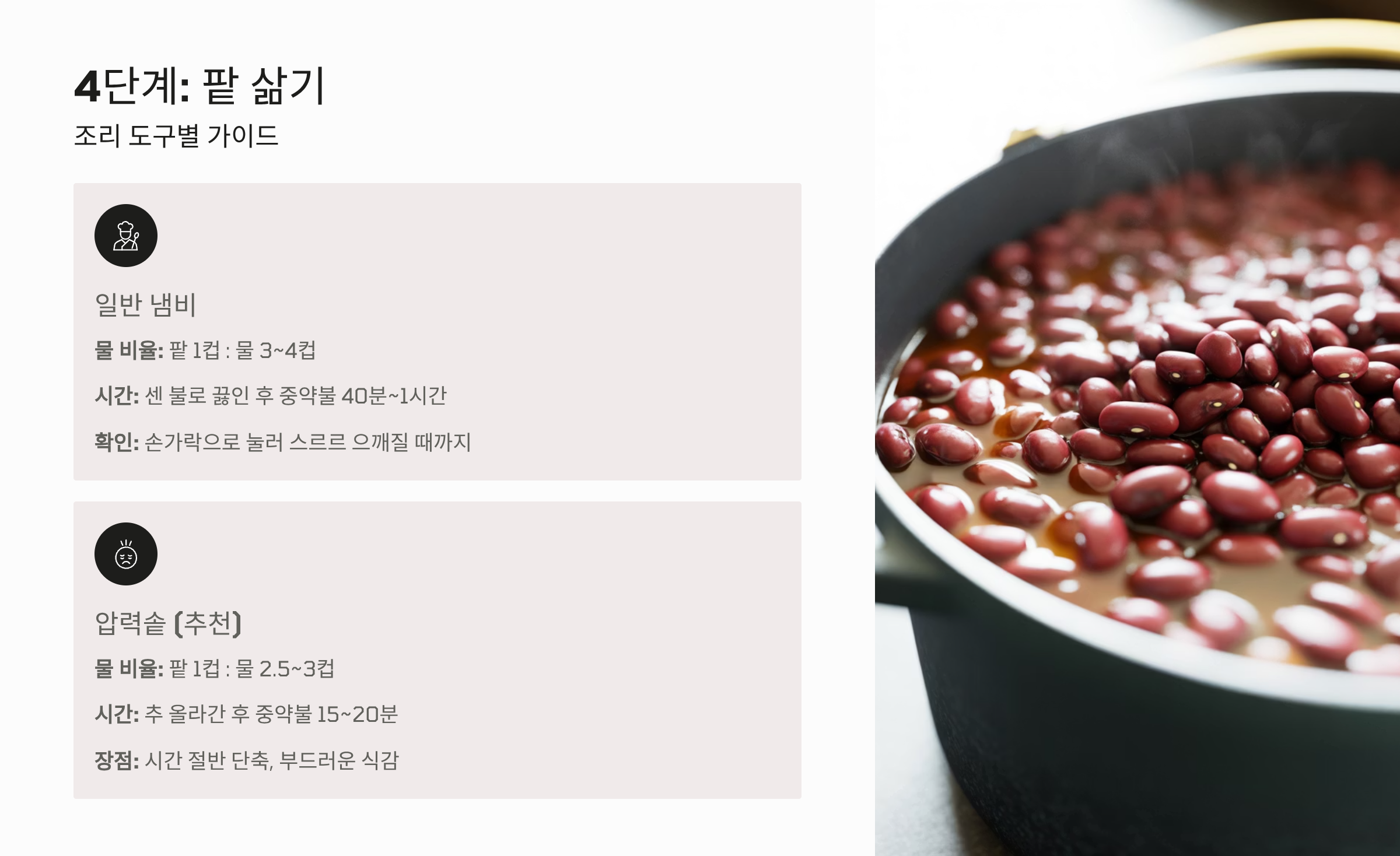 • 비율: 팥 1컵 기준 물 2.5~3컵을 붓습니다. (증발량이 적으므로 물을 적게 잡습니다.)