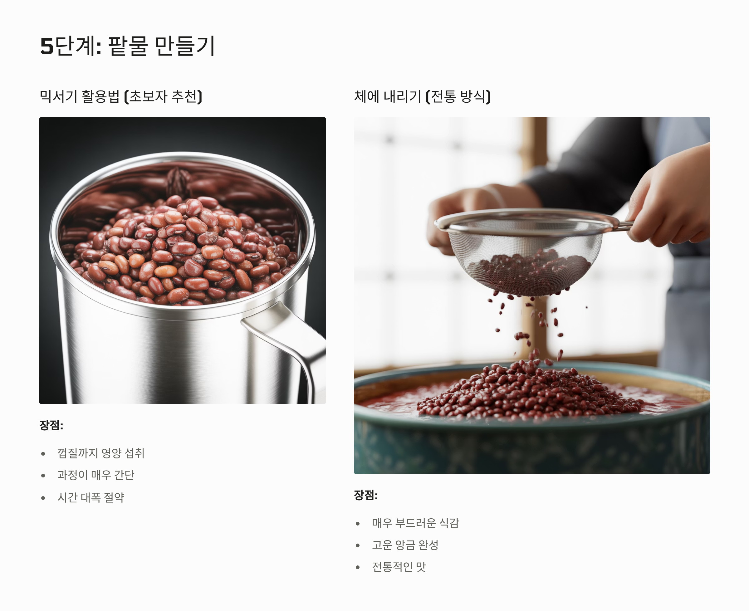 - 장점: 껍질이 제거되어 식감이 매우 부드럽고 고운 팥죽이 완성됩니다. 하지만 시간이 오래 걸리고 손목에 무리가 갈 수 있습니다.